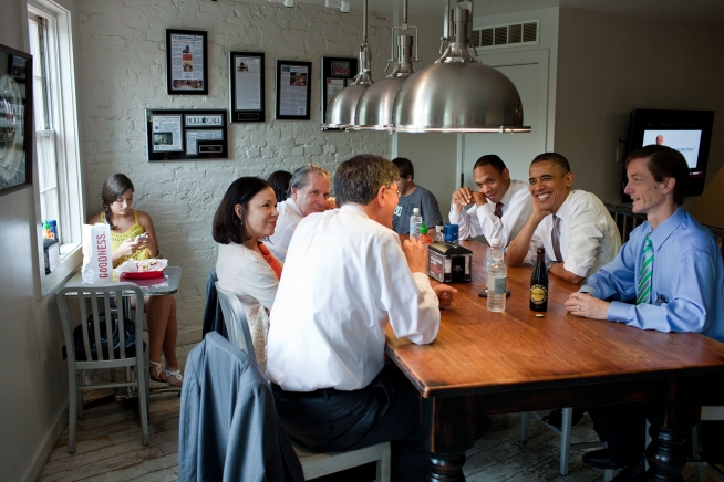 President Barack Obama has lunch with a group of advisors who worked on the debt negotiations, at Good Stuff Eatery in Washington, D.C., Aug. 3, 2011. Seated clockwise with the President are: Bruce Reed, Chief of Staff to the Vice President; OMB Director Jack Lew; Nancy-Ann DeParle, Deputy Chief of Staff for Policy; National Economic Council Director Gene Sperling; and Rob Nabors, Assistant to the President for Legislative Affairs. (Official White House Photo by Pete Souza)