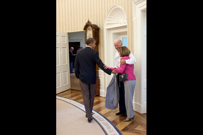 President Barack Obama and Vice President Joe Biden talk with House Minority Leader Nancy Pelosi following their meeting with Senate Majority Leader Harry Reid in the Oval Office to discuss ongoing efforts to find a balanced approach to the debt limit and deficit reduction, Saturday, July 30, 2011. (Official White House Photo by Pete Souza)