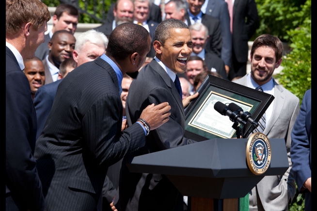 President Barack Obama receives a Green Bay Packers stock certificate from cornerback Charles Woodson during a ceremony honoring the Super Bowl XLV Champion Packers on the South Portico of the White House, Aug. 12, 2011. The Packers are the only publically owned professional sports franchise in the United States. Standing at right is quarterback Aaron Rodgers. (Official White House Photo by Chuck Kennedy)