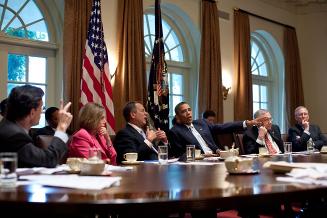 President Barack Obama meets with Congressional Leadership in the Cabinet Room of the White House to discuss ongoing efforts to find a balanced approach to the debt limit and deficit reduction, July 13, 2011. Pictured, from left, are: House Majority Leader Eric Cantor, House Minority Leader Nancy Pelosi, House Speaker John Boehner, Senate Majority Leader Harry Reid, and Senate Minority Leader Mitch McConnell. (Official White House Photo by Pete Souza)