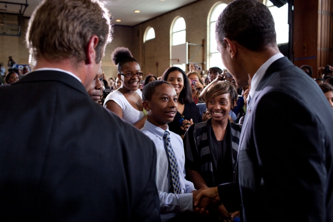 President Barack Obama shakes hands with students after delivering his third annual Back-to-School speech at Benjamin Banneker Academic High School in Washington, D.C. Sept. 28, 2011. (Official White House Photo by Pete Souza)