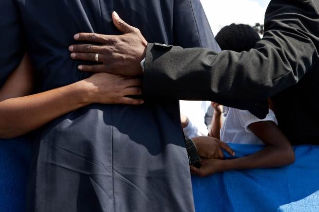 President Barack Obama talks with guests following a ceremony honoring those who lost their lives and to commemorate the tenth anniversary of the 9/11 attacks against the United States, at the Flight 93 National Memorial in Shanksville, Pa., Sunday, Sept. 11, 2011. (Official White House Photo by Pete Souza)