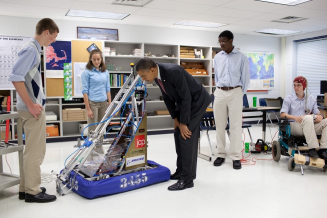 President Barack Obama examines a robot created in the school’s prototyping and robotics senior research labs at Thomas Jefferson High School for Science and Technology in Alexandria, Va., Sept. 16, 2011. (Official White House Photo by Pete Souza)