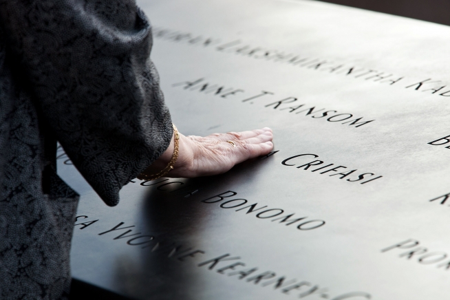 A woman touches a name on the edge of the North Pool at the National September 11 Memorial in New York, N.Y., Sunday, Sept. 11, 2011. (Official White House Photo by Chuck Kennedy)