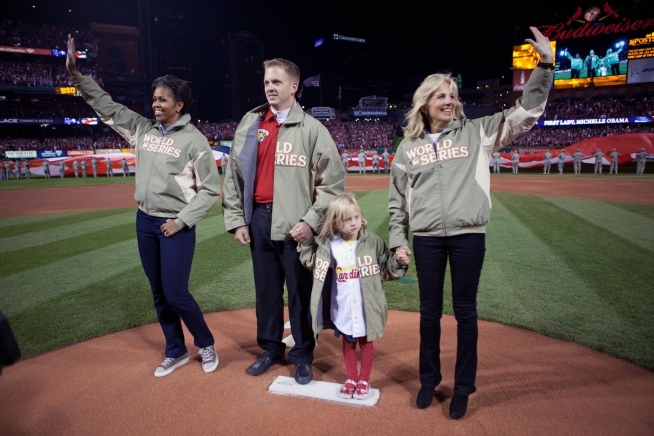 First Lady Michelle Obama and Dr. Jill Biden participate, with Marine Lance Cpl. James Sperry and his daughter Hannah, 5, in a Joining Forces with Major League Baseball pre-game ceremony prior to Game 1 of the World Series between the St. Louis Cardinals and the Texas Rangers at Busch Stadium in St. Louis, Mo., Oct. 19, 2011. (Official White House Photo by Lawrence Jackson)