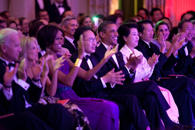 President Barack Obama and First Lady Michelle Obama, President Lee Myung-bak of the Republic of Korea and First Lady Kim Yoon-ok applaud during the State Dinner performance in the State Dining Room of the White House, Oct. 13, 2011. (Official White House Photo by Pete Souza)