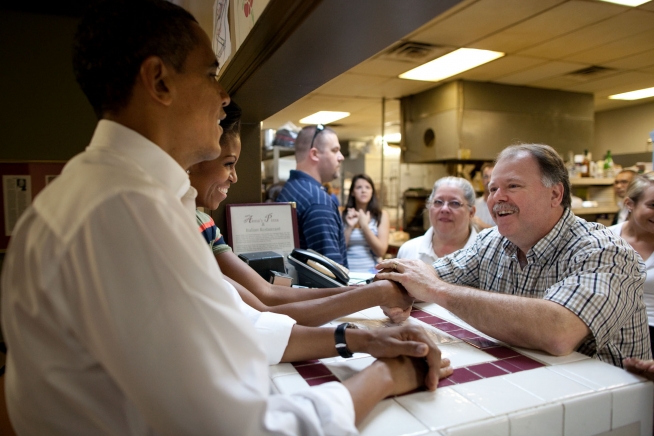 President Barack Obama and First Lady Michelle Obama greet the staff while ordering pizza during a stop at Anna’s Pizza and Italian Kitchen in Hampton, Va., Oct. 19, 2011. (Official White House Photo by Pete Souza)
