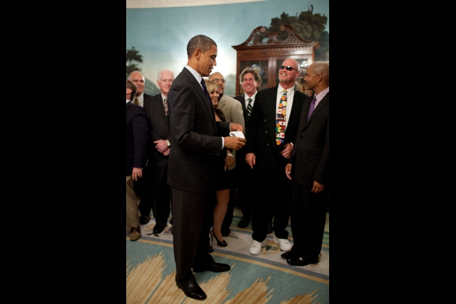 President Barack Obama looks at a headband presented by former quarterback Jim McMahon, in sunglasses, as he greets members of the 1985 Super Bowl Champion Chicago Bears in the Diplomatic Reception Room of the White House, Oct. 7, 2011. The visit was a makeup trip for the Super Bowl XX champions, whose 1986 reception was cancelled due to the Space Shuttle Challenger tragedy. (Official White House Photo by Pete Souza)