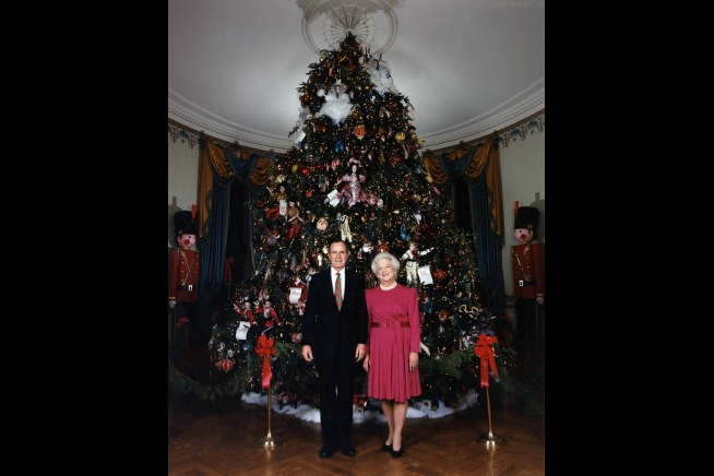 President George H.W. Bush and First Lady Barbara Bush pose in front of the White House Christmas tree. December 8, 1992