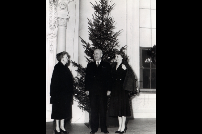President Truman and First Lady Bess Truman under the North Portico with the Christmas tree