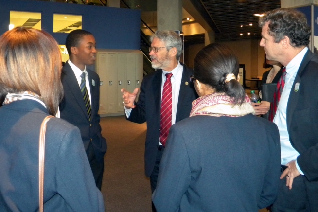 Dr. Holdren talks with students at the MC2STEM school in the Great Lakes Science Center. (Photo courtesy MC2STEM High School)