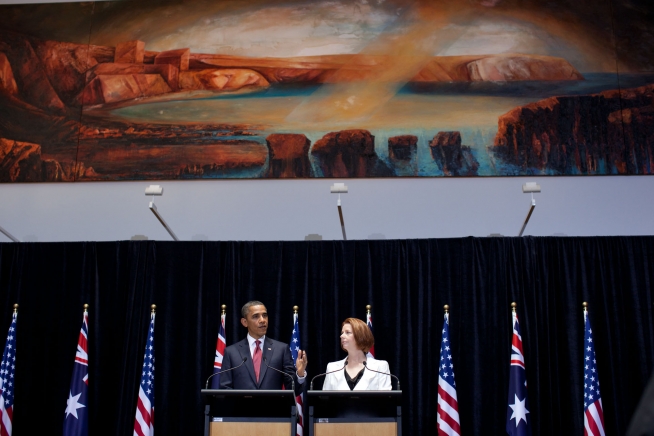 President Barack Obama participates in a joint press conference with Prime Minister Julia Gillard of Australia at Parliament House in Canberra, Australia, Nov. 16, 2011. (Official White House Photo by Pete Souza)