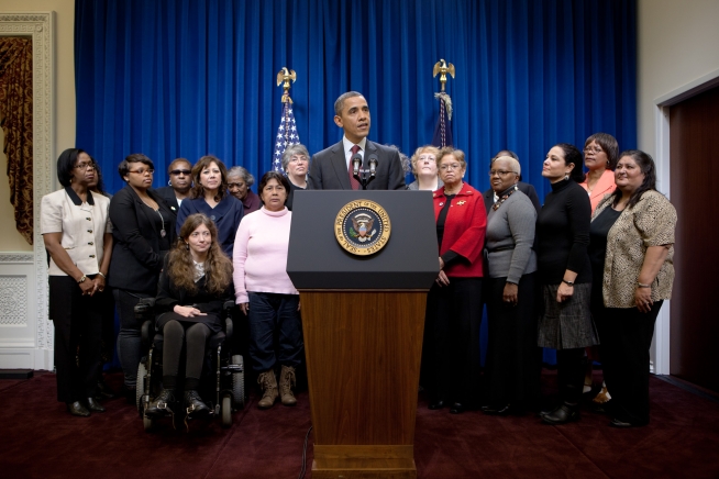 President Barack Obama delivers remarks on new minimum wage/overtime protections for in-home care workers at a “We Can’t Wait” event in Room 430 of the Eisenhower Executive Office Building of the White House, Dec. 15, 2011. Attendees include: Labor Secretary Hilda Solis, Karen Kulp, President & CEO Home Care Associates; and home care workers: Pauline Beck, Thelma Reta, Iterra Blackshear, Tracy Dudzinski, Manuela Butler, Elma Wauneetta Phillips, Bertie Caraway, Margaret Glover, Elva Munoz, Michelle Wise, Olive Nanette Lyons, April Jones-Britt, Martha Cobos, and Gilda Brown; and home care employers: Sascha M. Bittner and Robin L. Shaffert. (Official White House Photo by Lawrence Jackson)