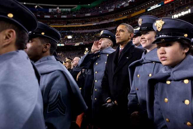 "Attending the annual Army vs. Navy football game at FedEx Field outside Washington, the President spent part of the first half watching the game with Midshipmen from the Naval Academy. During the second half, he crossed the field and watched with Cadets from the U.S. Military Academy (pictured here).