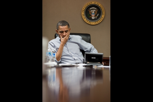 "More often than not, the President is in the office on most Saturdays to convene a national security or economic meeting. Here, on a Saturday in March, the President listens during a conference call on Libya in the Situation Room of the White House."