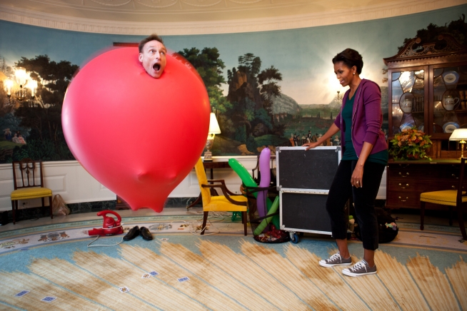 "This photograph by Chuck Kennedy has to catch your eye. It shows Guinness Book of World Records holder John Cassidy performing a balloon act for First Lady Michelle Obama in the Diplomatic Reception Room following a Let's Move event."