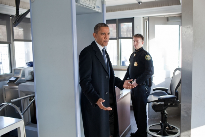 President Barack Obama talks to Secret Service Uniformed Division officers as he walks through the magnetometer in the Northwest Gatehouse at the White House, following his visit to Blair House, Dec. 9, 2011. The President told a reporter as he exited the gatehouse, "I just wanted to see what it was like getting in here." (Official White House Photo by Pete Souza)