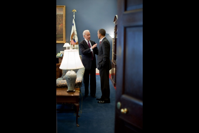 President Barack Obama talks with Vice President Joe Biden in the Vice President's West Wing Office at the White House, Dec. 15, 2011. (Official White House Photo by Pete Souza)