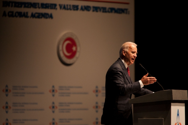 Vice President Joe Biden addresses the second Global Entrepreneurship Summit at the convention center in Istanbul, Turkey, December 3, 2011.