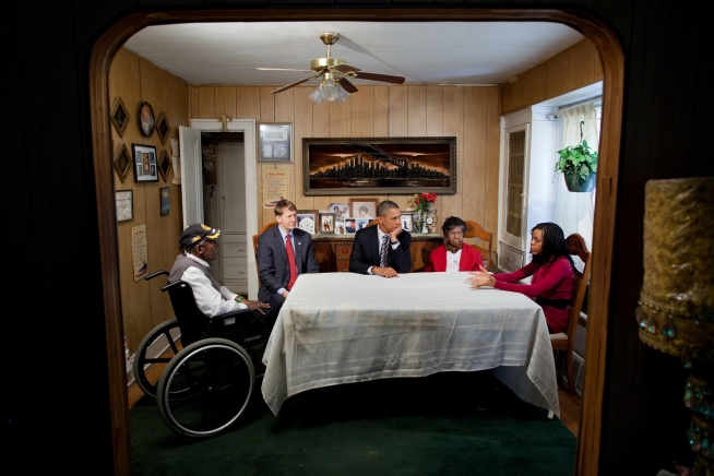 President Barack Obama participates in a discussion with, from left: Mr. William Eason; Richard Cordray, former Ohio Attorney General and nominee as director of the Consumer Financial Protection Bureau; Mrs. Endia Eason; and Deonna Kirkpatrick, Communications Director ESOP (Empowering and Strengthening Ohio's People), at the Eason home in Cleveland, Ohio, Jan. 4, 2012. (Official White House Photo by Pete Souza)