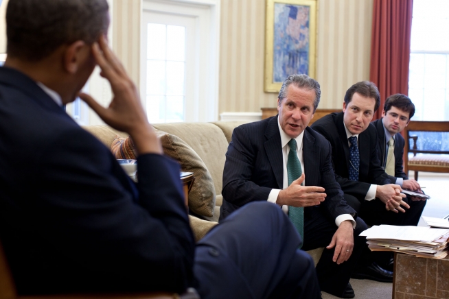 President Barack Obama meets with, from left, National Economic Council Director Gene Sperling, Jason Miller, Special Assistant to the President for Manufacturing Policy, and Senior Policy Advisor Jacob Leibenluft, in the Oval Office, Jan. 11, 2012. (Official White House Photo by Pete Souza)