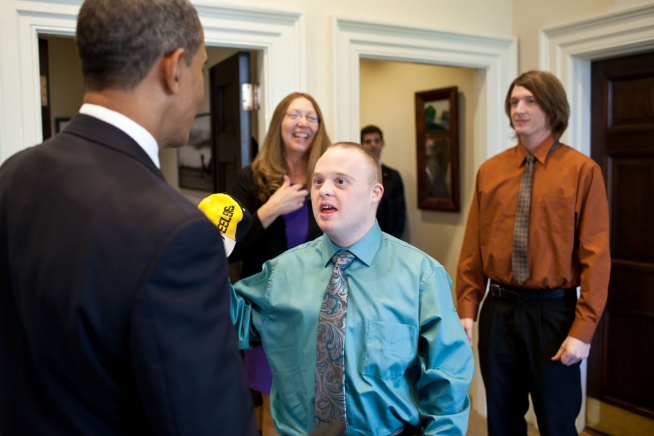 President Barack Obama greets Jeremy Carr in the Outer Oval Office, Jan. 13, 2012. Carr's mother, Teresa Carr, and brother, Bobby Carr, join him. (Official White House Photo by Pete Souza)