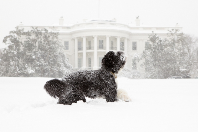 Bo, the Obama's family pet, plays in the snow during a blizzard on the south grounds of the White House, Feb. 10, 2010.