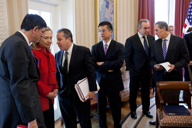 From left, Chief of Staff Jack Lew, Secretary of State Hillary Rodham Clinton, National Economic Council Director Gene Sperling and U.S. Ambassador to China Gary Locke confer as President Barack Obama holds a bilateral meeting with Vice President Xi Jinping of the People’s Republic of China in the Oval Office, Feb. 14, 2012. Kurt Campbell, Assistant Secretary of State for East Asian and Pacific Affairs; Mike Froman, Deputy National Security Advisor for International Economics; and Lael Brainard, Under Secretary of the Treasury for International Affairs, are also pictured. (Official White House Photo by Pete Souza)