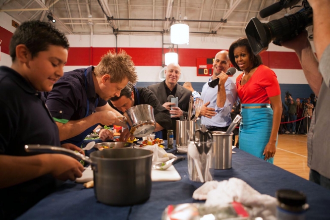 First Lady Michelle Obama, Sam Kass, Senior Policy Advisor for Healthy Food Initiatives, and Top Chef Head Judge Tom Colicchio, center, watch as "chef'testants" from past seasons of “Top Chef" take part in a cooking competition at the Kleberg Rylie Recreation Center in Dallas, Texas, Feb. 10, 2012. The contest highlighted the work being done in schools across America to provide healthier food to students. (Official White House Photo by Sonya N. Hebert)