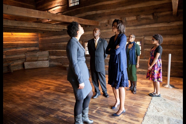 First Lady Michelle Obama views The Slave Pen exhibit while touring the National Underground Railroad Freedom Center in Cincinnati, Ohio, Feb. 23, 2012. Pictured, from left, are: Dina Bailey, Associate Curator of the National Underground Railroad Freedom Center; Cincinnati Mayor Mark Mallory; Verna Williams; and Allison Singleton. (Official White House Photo by Sonya N. Hebert)