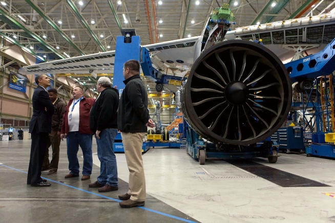 President Barack Obama talks with employees during a tour of the Boeing-Everett Production Facility in Everett, Wash., Feb. 17, 2012. (Official White House Photo by Lawrence Jackson)