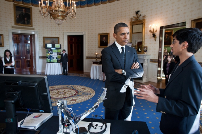 President Barack Obama talks with Anand Srinivasan, 15, in the Blue Room, Feb. 7, 2012, during the second annual White House Science Fair celebrating student winners of science, technology, engineering, and math (STEM) competitions from across the country. Srinivasan, a sophomore from Roswell High School in Roswell, Ga., was a finalist in the Google Science Fair for his project, which examines the use of electroencephalography (EEG) and prosthetic technology to make a more functional artificial limb. (Official White House Photo by Pete Souza)