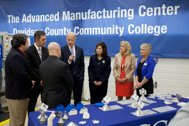Vice President Joe Biden, Dr. Jill Biden, and Secretary of Labor Hilda Solis tour the manufacturing training facility at Davidson County Community College, in Thomasville, North Carolina, February 24, 2012. The Vice President Joined Dr. Biden and Secretary Solis for the last stop of their community college tour to announce the availability of $500 million to fund partnerships between community colleges and businesses to train workers with skills employers need.