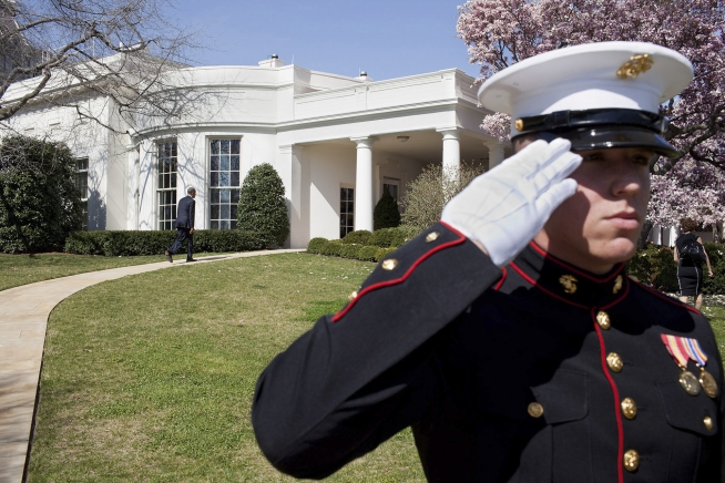 A Marine salutes as President Barack Obama returns to the Oval Office after saying goodbye to Prime Minister David Cameron of the United Kingdom on the South Grounds of the White House, March 14, 2012. (Official White House Photo by Pete Souza)