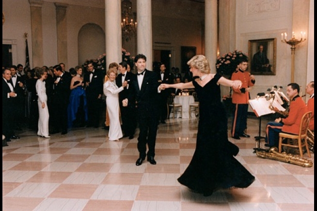The Marine Band provides after-dinner music for the visit of the Prince and Princess of Wales. Nancy Reagan encouraged actor John Travolta to dance with Princess Diana to music from Saturday Night Fever, November 9, 1985.