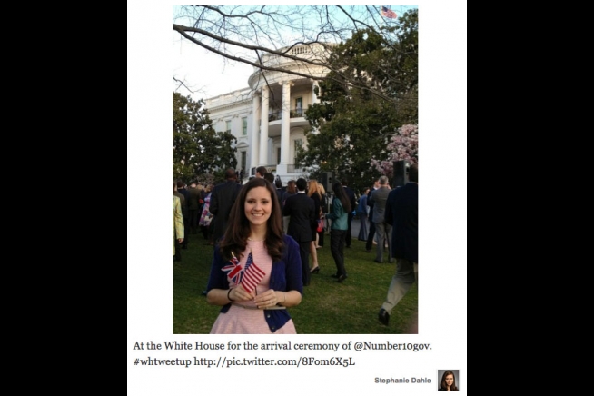 White House tweetup attendee @StephanieDahle poses for a twitter picture at the UK Arrival Ceremony on the South Lawn of the White House.