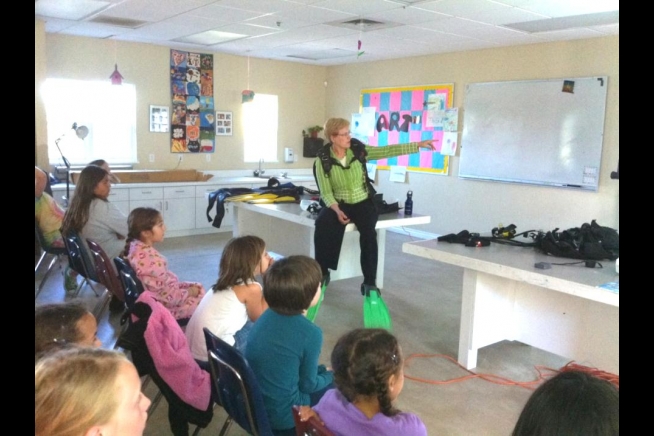 Dr. Jane Lubchenco demonstrates an ocean explorer’s toolkit to students in Santa Barbara, CA. (Photo courtesy of NOAA)