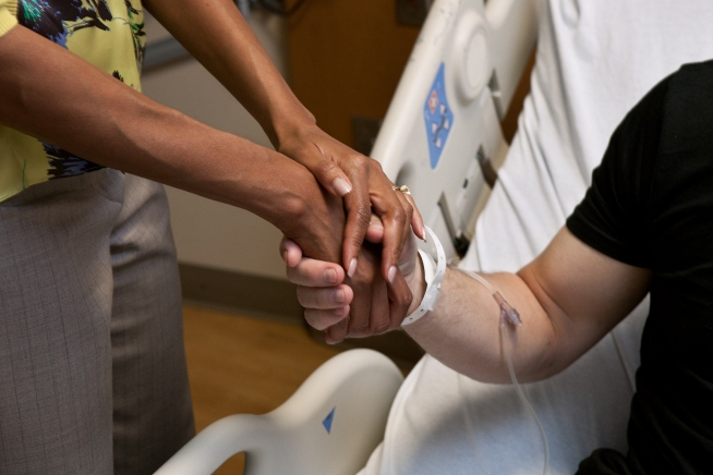 First Lady Michelle Obama greets a wounded warrior recovering at Walter Reed National Military Medical Center in Bethesda, Md., April 4, 2012. (Official White House Photo by Chuck Kennedy)