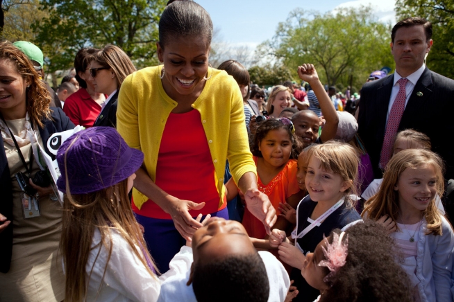First Lady Michelle Obama greets young guests during the 2012 White House Easter Egg Roll on the South Lawn, April 9, 2012. (Official White House Photo by Sonya N. Hebert)