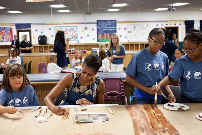 First Lady Michelle Obama works on backdrop props for student theater production of "Annie" during a visit to the Naval Air Station Oceana Summer Camp in Virginia Beach, Va., July 21, 2011. Mrs. Obama toured the camp and later welcomed local military families to a special screening of "Harry Potter and the Deathly Hallows Part 2" as part of the Joining Forces Movie Series. (Official White House Photo by Samantha Appleton)
