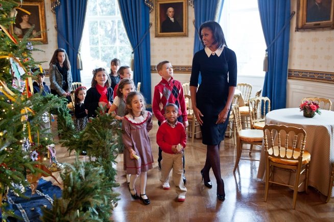 First Lady Michelle Obama walks with children past the official White House Christmas Tree in the Blue Room, Nov. 30, 2011. Mrs. Obama welcomed military families to the White House for for the first viewing of the 2011 holiday decorations, which included the 18-foot-6 inch balsam fir decorated with ornaments created by military children and medals, badges, and patches from all of the military branches. (Official White House Photo by Lawrence Jackson)