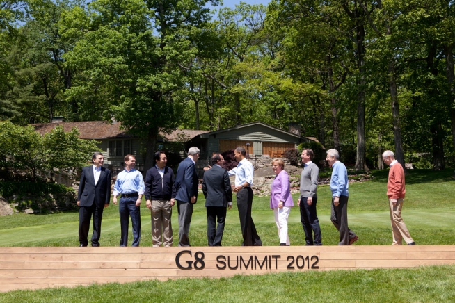 President Barack Obama participates in the G8 Summit family photo behind Aspen Cabin at Camp David, Md., May 19, 2012. (Official White House Photo by Chuck Kennedy)
