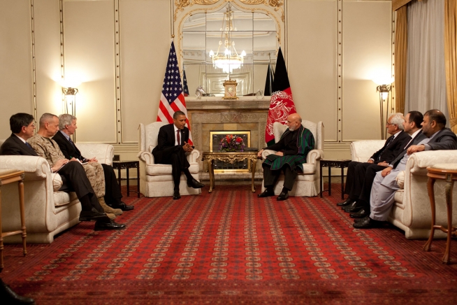 President Barack Obama participates in a bilateral meeting with Afghan President Hamid Karzai at the Presidential Palace in Kabul, Afghanistan, May 1, 2012. (Official White House Photo by Pete Souza)