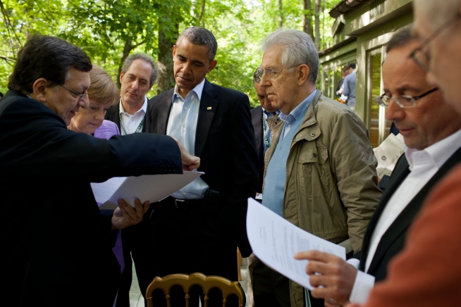 President Barack Obama talks with José Manuel Barroso, President of the European Commission, Chancellor Angela Merkel of Germany, Prime Minister Mario Monti of Italy, President François Hollande of France, and Herman Van Rompuy, President of the European Council, on the Laurel Cabin patio before the start of a G8 Summit working session at Camp David, Md., May 19, 2012. Mike Froman, Deputy NSA for International and Economic Affairs, listens in the background, third from left. (Official White House Photo by Pete Souza)