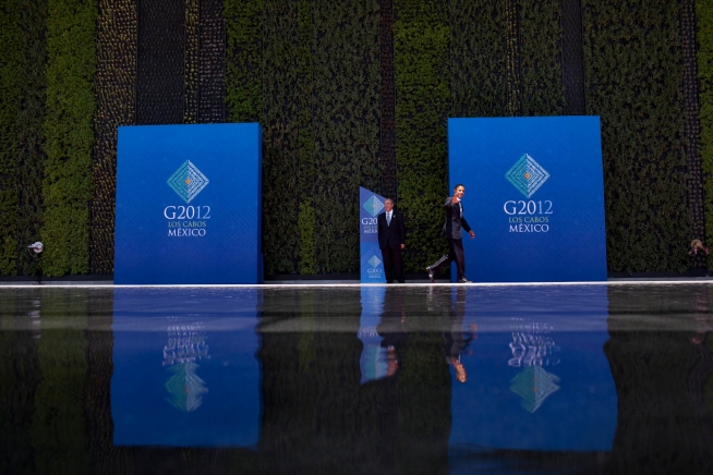 President Barack Obama waves after greeting President Felipe Calderón of Mexico upon his arrival at Los Cabos Convention Center for the G20 Summit in Los Cabos, Mexico, June 18, 2012. (Official White House Photo by Chuck Kennedy)