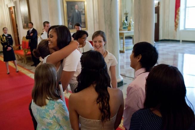 First Lady Michelle Obama greets White House mentees in the Cross Hall of the White House before an event celebrating their graduation, June 12, 2012. (Official White House Photo by Sonya N. Hebert)