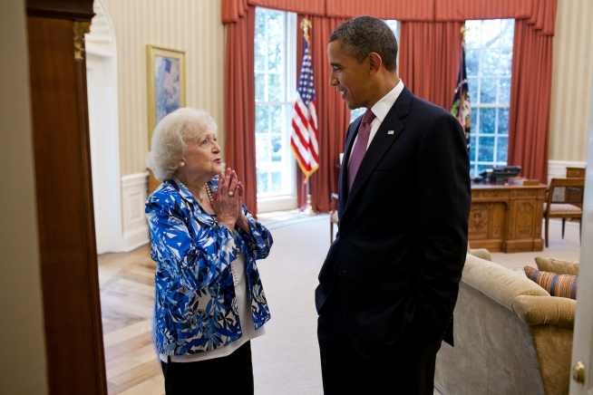 President Barack Obama talks with Betty White in the Oval Office, June 11, 2012. (Official White House Photo by Pete Souza)