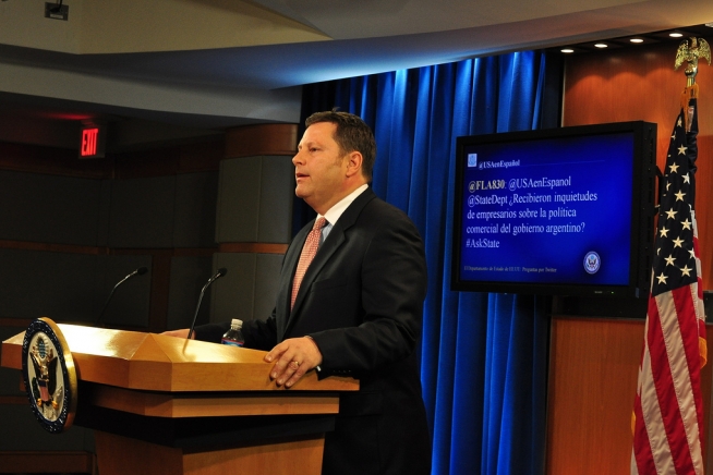 El sub secretario para asuntos públicos, Mike Hammer, responde preguntas a través de Twitter desde el podio en la sala de prensa del Departamento de Estado.