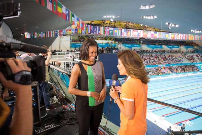 First Lady Michelle Obama participates in an interview with NBC Sports after watching the swimming finals and medal ceremony at the Olympic Park Aquatics Center during the 2012 Summer Olympic Games in London, England, July 28, 2012. (Official White House Photo by Sonya N. Hebert)