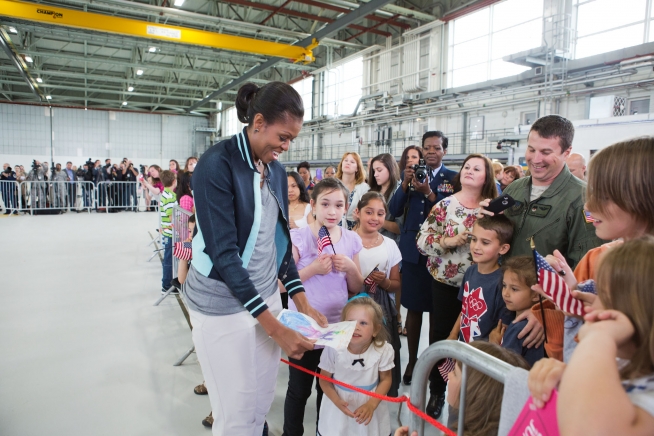First Lady Michelle Obama looks at a drawing given to her by one of the children while visiting with military base members in a hanger at Mildenhall Air Force Base in England, July 29, 2012. (Official White House Photo by Sonya N. Hebert)